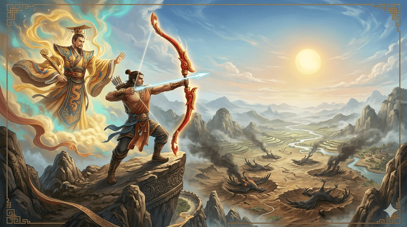 The Divine Archer The Emperor of Heaven saw the tragedy and sent the divine archer, Hou Yi, to help. Hou Yi was a master of the bow, possessing strength that could shake mountains. He first tried to reason with the suns, asking them to return to their tree. But the suns, blinded by their own brilliance, ignored him and continued to burn the world. Realizing that words were not enough, Hou Yi drew his red bow and took aim.
